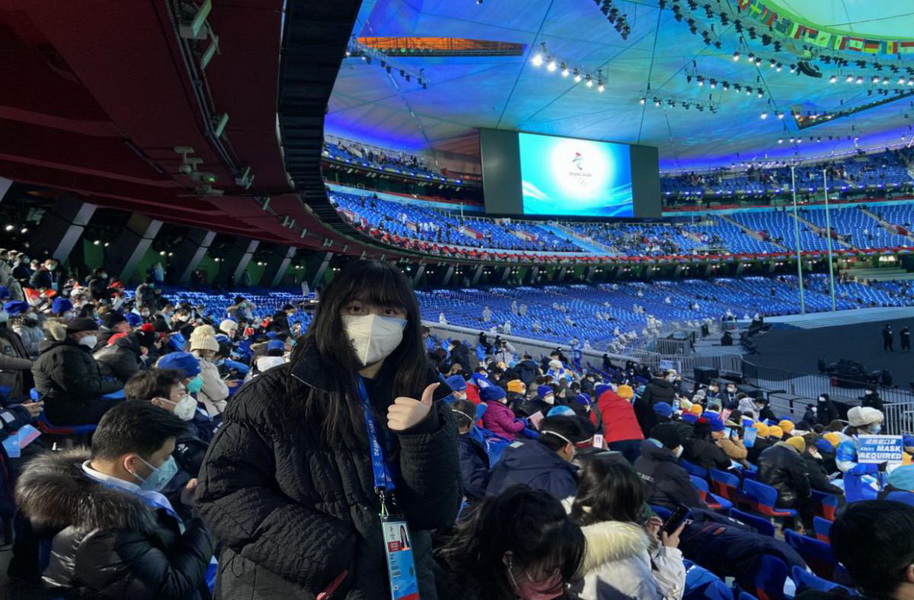 这次的北京冬奥会开幕式将“中国元素”与现代科技交相辉映。给全球观众带来前所未有的参与感和体验感,也是非常令人震撼的,我们通过朋友圈看到于慕孜学姐也去了冬奥会开幕式现场,我想请问一下于慕孜学姐,在冬奥会开幕式现场所看到的是不是更为精彩与震撼?有哪些感悟想与我们分享?